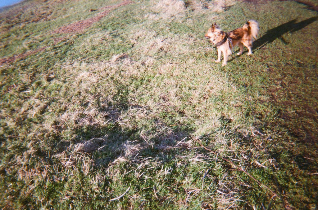 March 2024 // I took this photo of a dent in the earth, S. standing at its upper edge snout to the wind. She must have been wagging her tail (pleasure?) either in broad ecstatic circles or on the decline. From its tilt it could be both, easily. (Later, on jouissance and her cyclon-ing ; sophia and I at a wedding, on the dance floor, cyclon-ing with boys and girls). Port Meadow in March burnt and wet, some mornings frosty. I never let her off the leash. (Later, on ‘unleashing’). Liquid returning to the broad muddy plains across which you could see another village and looking left past the houseboats and canal, the Thames. I was composing a document on wallows and wallowing but this document is still imaginary. I remember now the little disposable lens round as if surprised, fingers blanched from wind, taking this photograph tagging it ‘Depression!’
